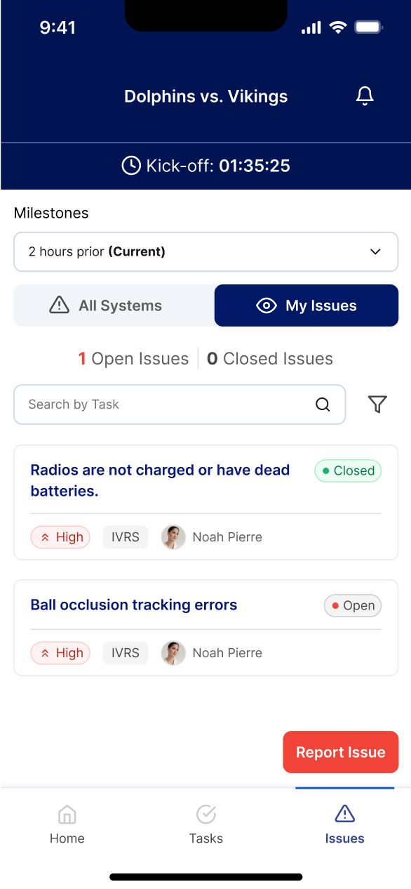 An NFL admin can view all open issues across all venues and games and their concentration around certain tasks to help them assess urgency, make critical decisions, and improve continuously.