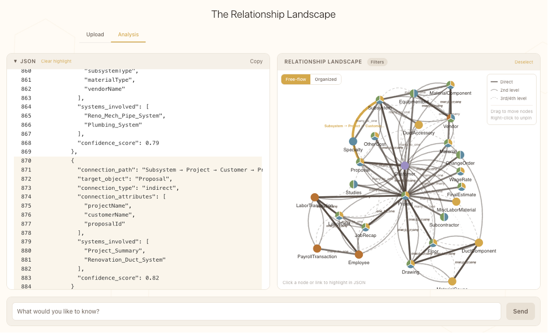 A Relationship Landscape created by the model that maps cross-system data connections to transform siloed data into a unified object model
